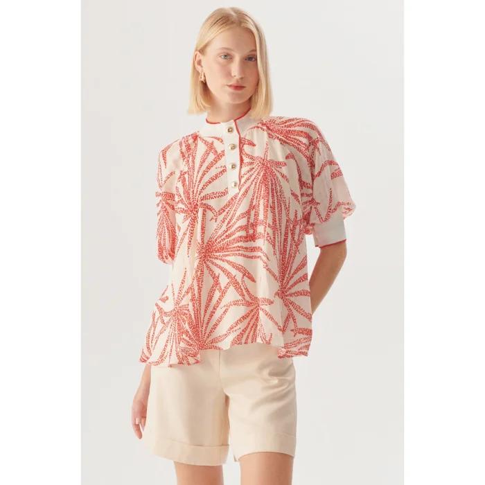 Ürün: Yaprak Desenli Düğme Detaylı Rahat Kesim Rayon Şifon Bluz