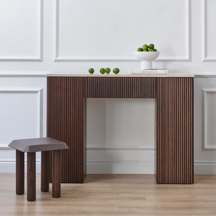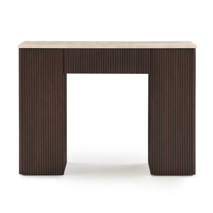 Masif Ceviz Kaplamadan üretilmiştir. Masif kaplamanın yapısı gereği ton ve damar farklılıkları gösterebilir. Tabla ; Traverten