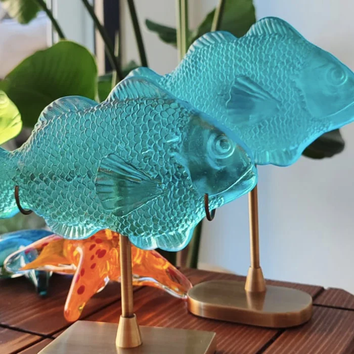 Balık kısmı kalıpla şekillenmiş cam, ayak kısmı pirinç.