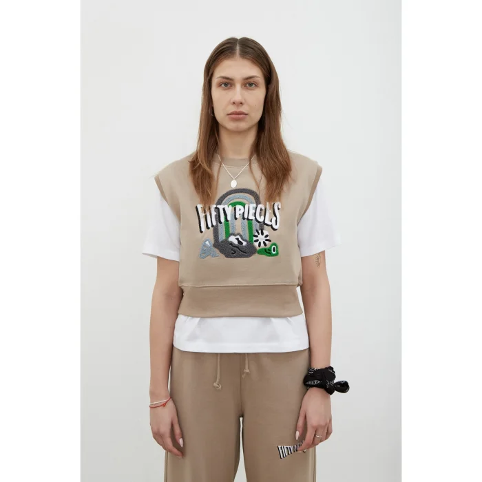 0 yakalı, düşük omuzlu, önünde Fifty Pieces logo baskılı, oversize t-shirt.