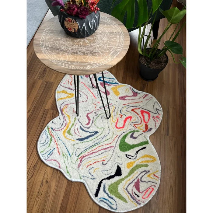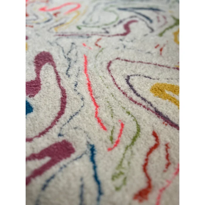 Akrilik ve pamuk iplikten üretilen tasarımımız tufting tekniği ile dokunarak üretilmiştir.