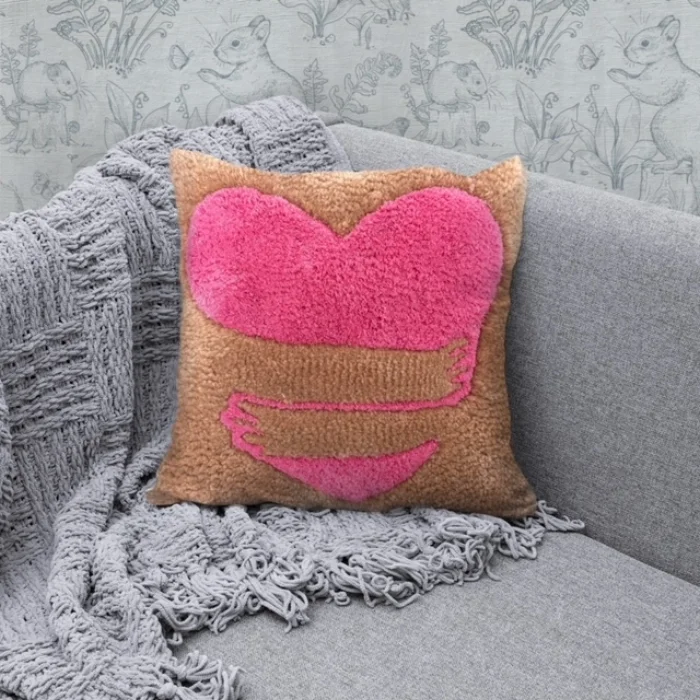 Kalp Kırlentimiz tufting dokuma tekniği ile üretilmiştir. Tasarımı tamamen bize ait olan ürünümüzün içeriğinde akrilik ve pamuk iplik kullanılmıştır.