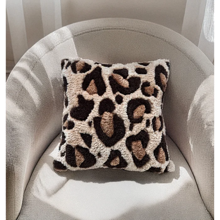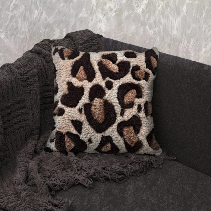 Leopar Kırlentimiz tufting dokuma tekniği ile üretilmiştir. Tasarımı tamamen bize ait olan ürünümüzün içeriğinde akrilik ve pamuk iplik kullanılmıştır.