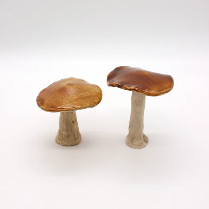 Bu seramik mantar objeler seti, biri büyük, biri küçük olmak üzere iki parçadan oluşmaktadır. Tamamen el yapımı ve el boyamasıdır. Dayanıklı seramikten üretilmiş olup, üzerindeki renkler ve detaylar özenle uygulanmıştır. Dekoratif amaçlıdır; sehpa, raf, kitaplık veya vitrin gibi alanlarda kullanılabilir. Her mantar, el işçiliğiyle yapıldığı için ufak farklılıklar gösterir ve bu da her bir objeyi benzersiz ve özel kılar. Doğadan ilham alan tasarımıyla yılın her döneminde evinize sıcaklık ve sevimlilik katacak bir dekor parçasıdır.