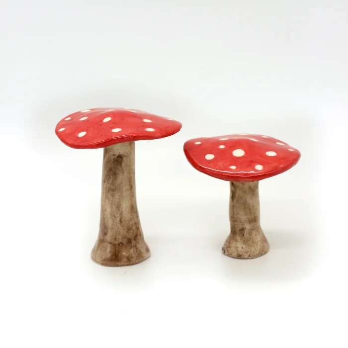 Bu seramik mantar objeler seti, biri büyük, biri küçük olmak üzere iki parçadan oluşmaktadır. Tamamen el yapımı ve el boyamasıdır. Dayanıklı seramikten üretilmiş olup, üzerindeki renkler ve detaylar özenle uygulanmıştır. Dekoratif amaçlıdır; sehpa, raf, kitaplık veya vitrin gibi alanlarda kullanılabilir. Her mantar, el işçiliğiyle yapıldığı için ufak farklılıklar gösterir ve bu da her bir objeyi benzersiz ve özel kılar. Doğadan ilham alan tasarımıyla yılın her döneminde evinize sıcaklık ve sevimlilik katacak bir dekor parçasıdır.