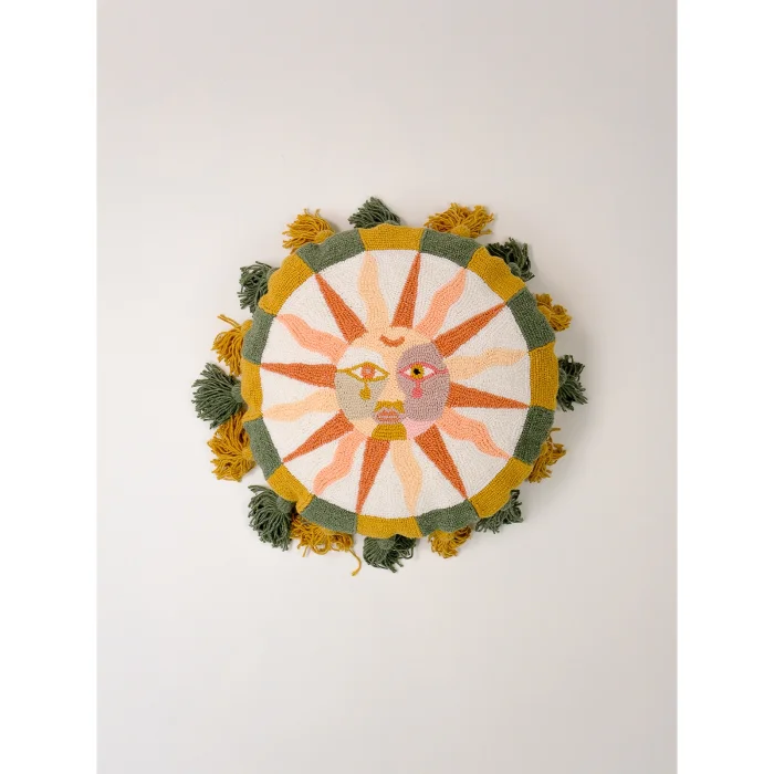 Güneşin mitolojik sembolünden ilham alan Helios, yuvarlak formu ve saçaklı kenar detaylarıyla dikkat çeker. El yapımı punch needle işçiliğiyle özenle işlenmiş güneş figürü, yaşam alanlarınıza mistik ve sanatsal bir hava katar. 40 cm çapındaki bu kırlent kılıfı, %65 pamuk ve %35 polyester kumaştan üretilmiştir.