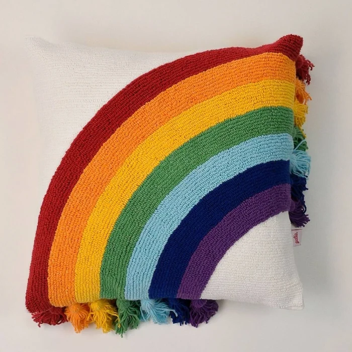 Gökkuşağının enerjisini evinize taşıyın. El yapımı punch needle işçiliğiyle hazırlanan bu kırlent kılıfı, salonunuza, yatak odanıza ya da çocuk odalarına pozitif bir dokunuş katar. Renkli ve canlı tasarımıyla hem boho hem de modern dekorasyonlara uyum sağlar.