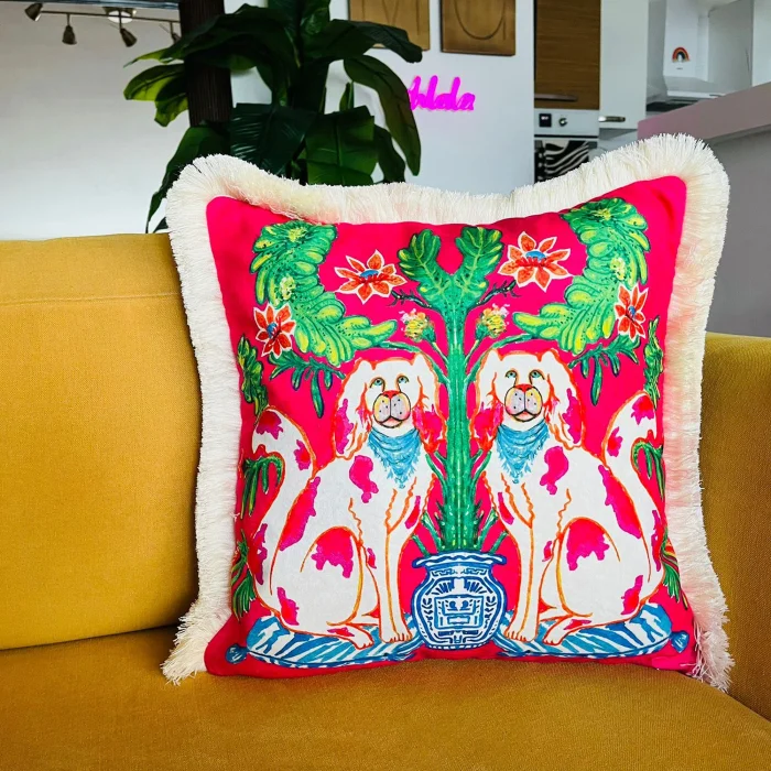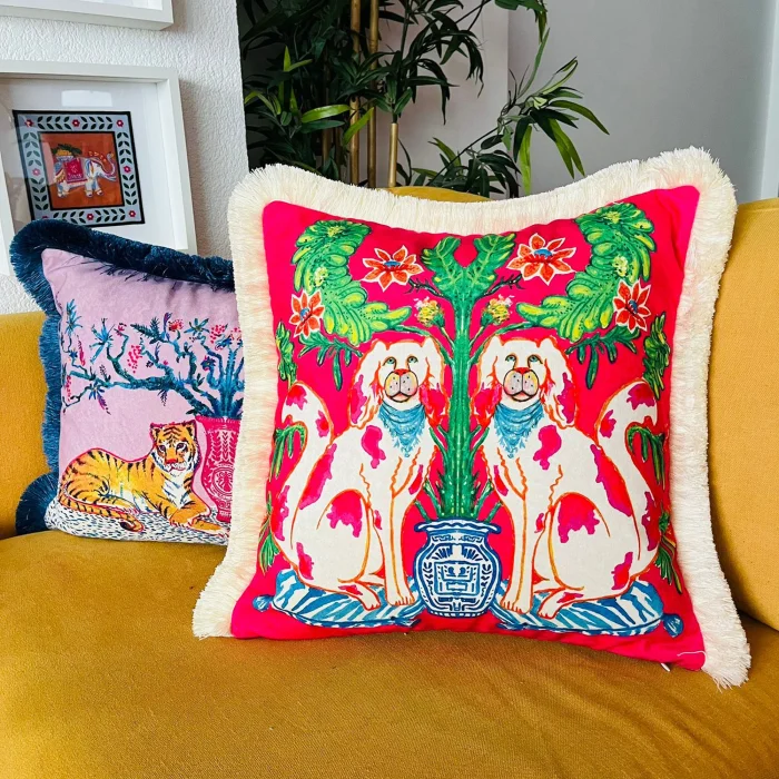 Ürün: Dekoratif Chinoiserie Köpek Desenli Kadife Kırlent Kılıfı