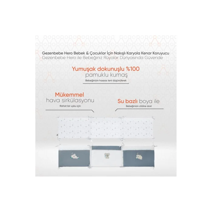 Ürün Açıklaması:Gezenbebe Hero Bebek & Çocuklar İçin Nakışlı Karyola Kenar Koruyucu (40X180): Bebeğinizin rüyalarını korurken, karyolasını da şıklıkla sarın: Gezenbebe'nin nakışlı dokunuşuyla.Gezenbebe Hero Nakışlı Karyola Kenar Koruyucu, miniklerinizin güvenliğini ve rahatlığını düşünerek tasarlanmıştır. Ahşap karyolaların sert kenarlarından koruma sağlamakla kalmaz, aynı zamanda yatak odasına estetik bir dokunuş katar. İkonik Gezenbebe deseni ve sevimli kahramanlar Fil, Koala, Ayıcık ve Tavşan'ın zarif nakışlarıyla zenginleştirilmiş bu koruyucu, hem fonksiyonel hem de dekoratif bir çözüm sunar. %100 pamuktan üretilen bu ürün, bebeğinizin hassas teni için yumuşak ve nefes alabilen bir yapıya sahiptir. Gezenbebe Hero ile bebeğinizin rüyalarını güvende tutarken, onun odasına da masalsı bir dokunuş ekleyin.Öne Çıkan Özellikler:GEZENBEBE'NİN BÜYÜLÜ İMZASI:Gezenbebe'nin ikonik deseni ve sevimli kahramanlarıyla, bebeğinizin odasına sihirli bir atmosfer katar.YÜKSEK KALİTELİ MATERYAL:%100 pamuklu kumaşıyla, Gezenbebe Hero Nakışlı Karyola Kenar Koruyucu, bebeğinizin cildine nazikçe dokunarak maksimum konfor sunar.TAM KORUMA:Yumuşak ve dolgun yapısıyla, bebeğinizin karyolanın kenarlarına çarpmasını önler, güvenli bir uyku alanı yaratır.MÜKEMMEL HAVA SİRKÜLASYONU:Özel tasarımı sayesinde hava sirkülasyonunu engellemez, bebeğinizin rahat bir uyku çekmesini sağlar.ESTETİK VE FONKSİYONEL:Hem odanızın dekorasyonunu zenginleştirir, hem de pratik bir kullanım sunar.CİLDİNİZE ZARAR VERMEZ:Su bazlı boya kullanımıyla, bebeğinizin hassas cildi için güvenli ve zararsızdır.SİZİN İÇİN HER ZAMAN EN İYİSİ:Müşteri geri bildirimlerini dikkate alarak, kalite ve rahatlıkta sınır tanımıyoruz.Teknik Detaylar:Ölçü: 40x180 cm.Malzeme: %100 pamuk.Uyum: Parmaklıklı tüm ahşap mobilyalar ile uyumludur, kolay montaj.Renk Seçenekleri: Bunny (Tavşan), Elephant (Fil), Koala (Koala) ve Teddy (Ayıcık)Bakım Talimatı: 30 derecede yıkayınız ve direkt güneş ışığına maruz bırakmadan kurutunuz.Gezenbebe Hero Nakışlı Karyola Kenar Koruyucu ile hem bebeğinizin güvenliği hem de rüyalarındaki masalsı dünyası garantide! Kalite ve estetiği bir araya getiren bu özel ürün, bebeğinizin konforu için en iyisini arayan ailelerin tercihi.