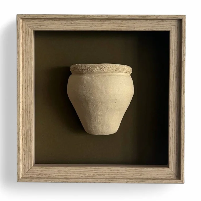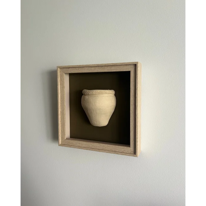 Ahşap görünümlü çerçeve içine gömülü küp şekli verilmiş, seramik üzerinde doku çalışması yapılmıştır, hakı renk paspartu kullanılmıştır.