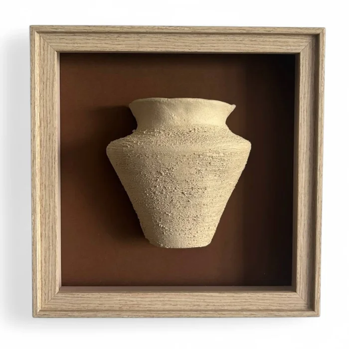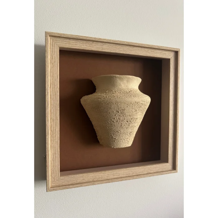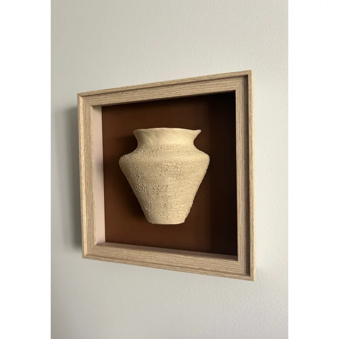 Ahşap görünümlü çerçeve içine gömülü küp şekli verilmiş, seramik üzerinde doku çalışması yapılmıştır, kahverengi renk paspartu kullanılmıştır.