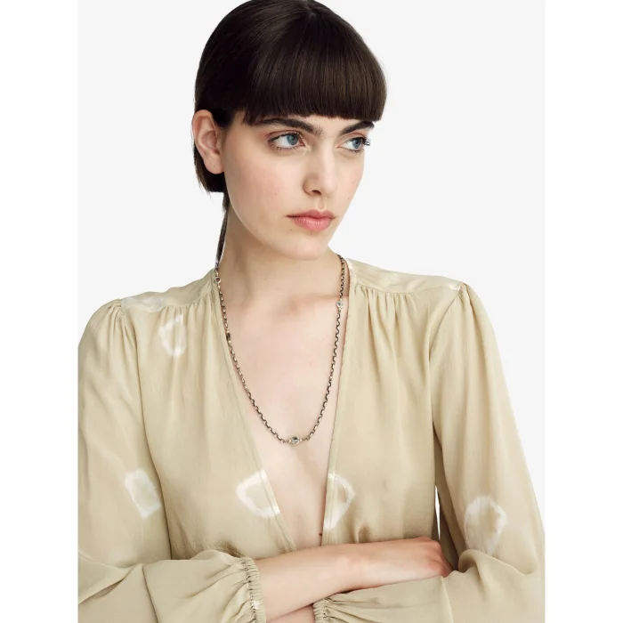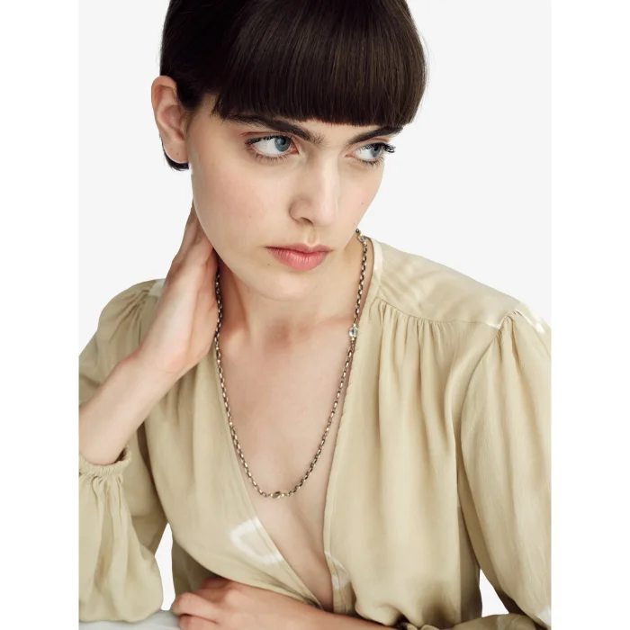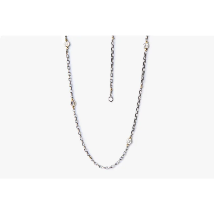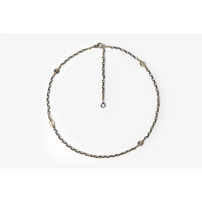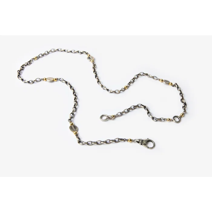 Handcrafted from sterling silver, this Silver Full Moon Chain Necklace features small, polished metal discs representing the full moon, each one a symbol of completion, illumination, and the cycles of life. Scattered throughout the chain, delicate gold beads represent other celestial bodies, offering a subtle yet radiant touch of contrast and warmth.