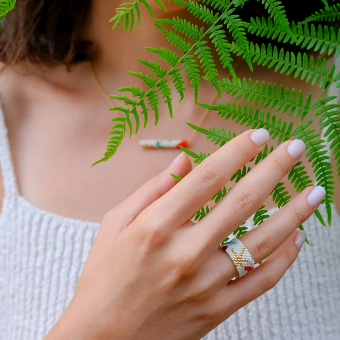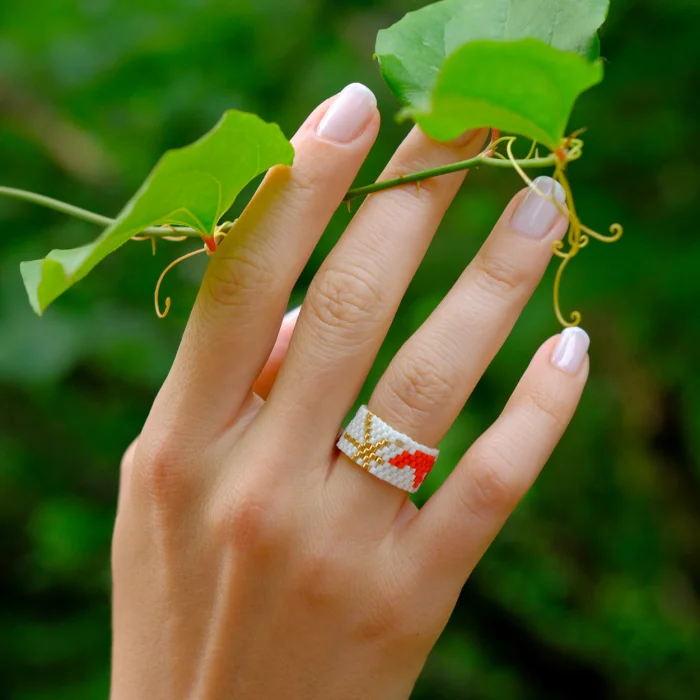 Yüzükler, cam boncuklar ile dikilerek üretilir. Esnek değildir.