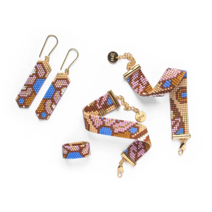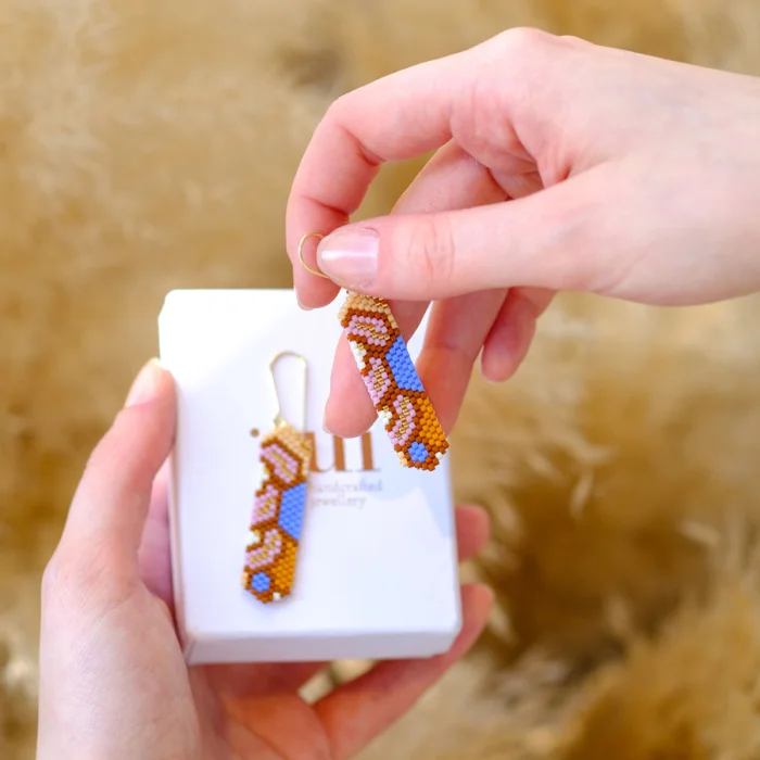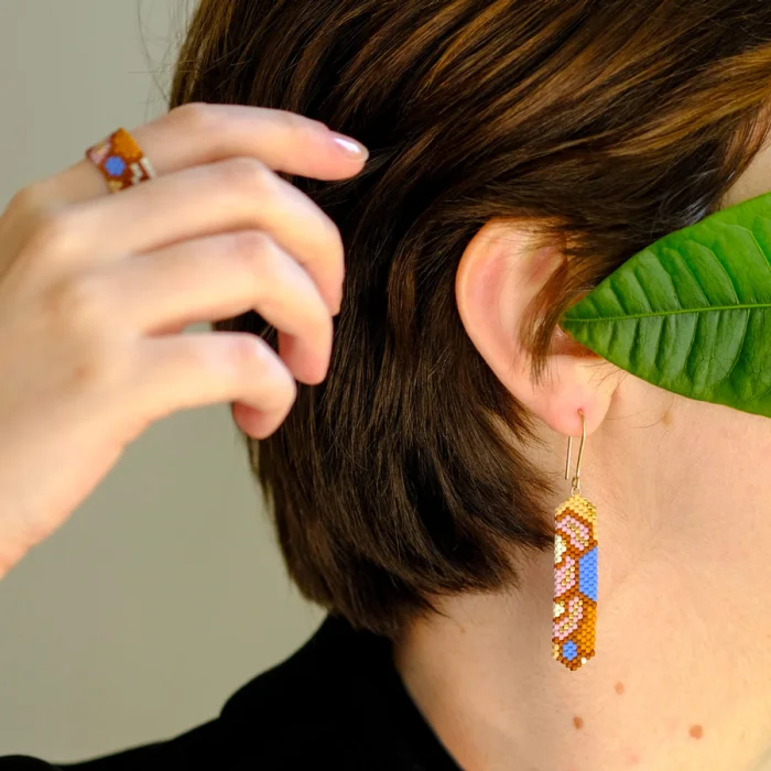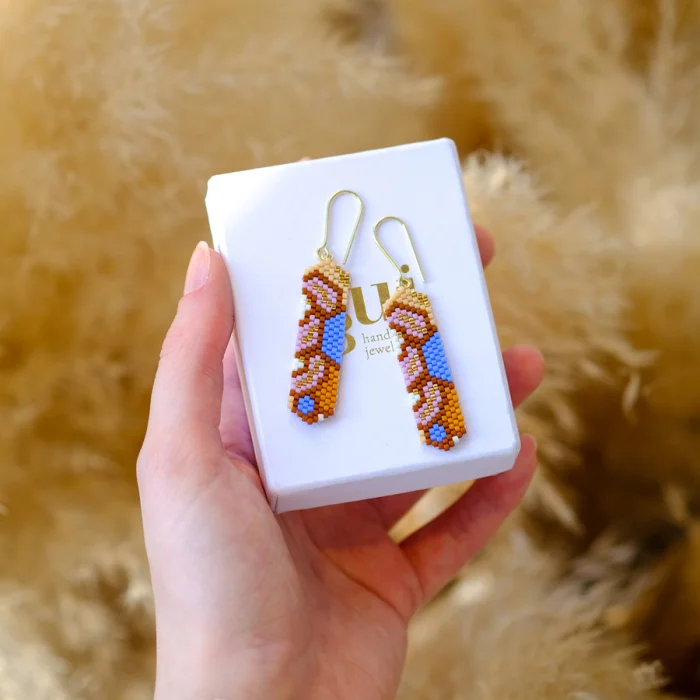 Küpeler cam boncuklar ile dikilerek üretilir. Küpe kancaları ise 925 ayar gümüş üzerine 14 ayar altın kaplamadır.