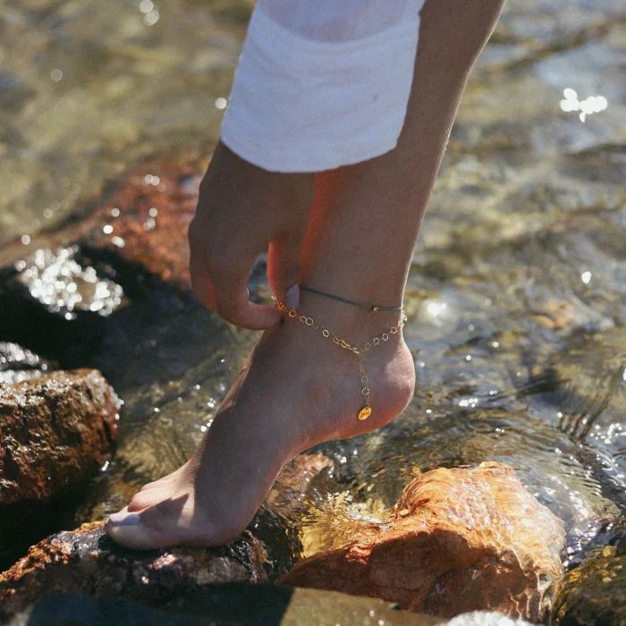 Halhallar 18 ayar altın kaplamalı pirinç boncuklarla üretilmiştir. Asansör düğümü yardımıyla farklı bileklik kalınlıklarına göre ayarlanabilir.