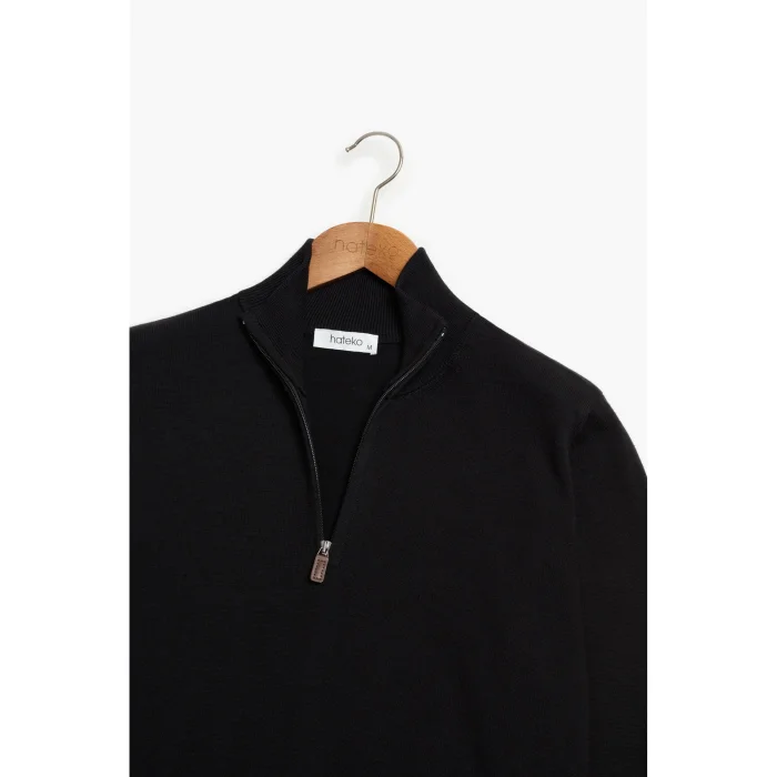 Yarım fermuarlı, dik yaka, düz desen, suni deri elcikli triko kazak