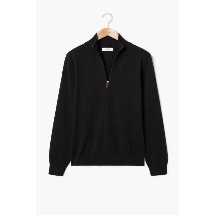 Yarım fermuarlı, dik yaka, düz desen, suni deri elcikli triko kazak