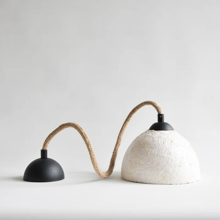Biyobozunur, miselyum sarkıt lamba. Jüt ip ile sarkan beyaz başlığıyla yaşam alanlarına yumuşak bir ışık ve organik bir okunuş vadediyor.