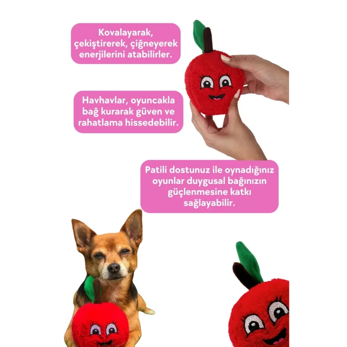 HavHav Kırmızı Elma Peluş Köpek Oyuncağı:Canlı kırmızı rengi ve yumuşak peluş dokusuyla, köpeğinizin dikkatini çeker ve oyun zamanını daha eğlenceli ve sevimli hale getirir. Hışırtı Sesli Köpek Oyuncağı:İçerisinde bulunan hışırtılı malzeme, köpeğinizin ilgisini çekmek için özel olarak tasarlanmıştır. Ayrıca yumuşak dokusu sayesinde, köpeğiniz oyuncağı rahatça kavrayabilir. Toksik Olmayan Güvenli Köpek Oyuncağı:Köpeğinizin sağlığı her zaman ön plandadır! Köpek sağlığına etki etmeyen, toksik olmayan malzemeler ile üretilmiştir. Bütün köpek oyuncakları ebeveyn gözetiminde oynatılmalıdır.