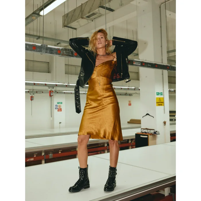 Aksesuarları light gold renginde, sırtı nakış ve trok işlemeli, siyah renk deri ceket.