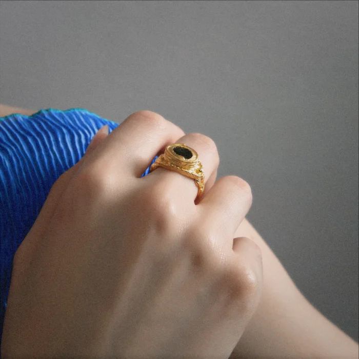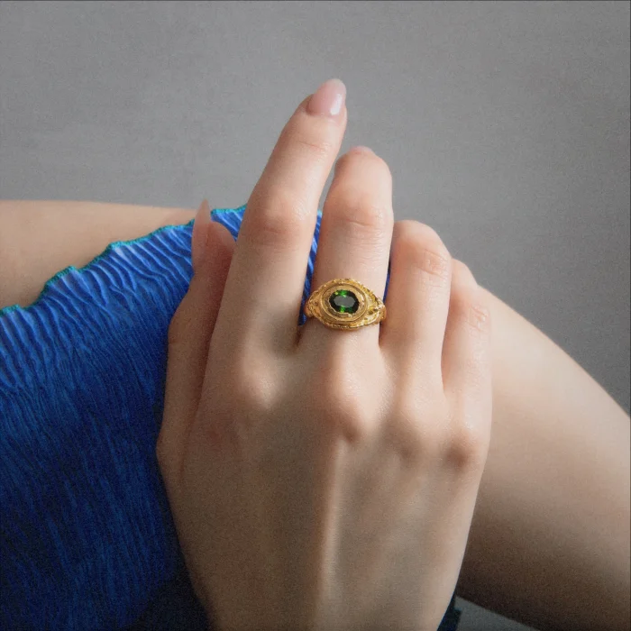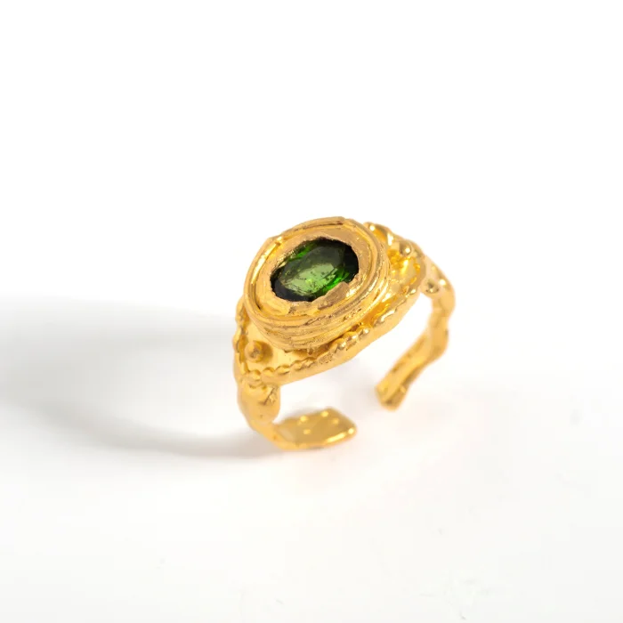 Artemis Yüzüğü, geri dönüştürülmüş 925 ayar gümüşten yapılmış, 24 ayar altın kaplamalıdır. Tamamen el yapımıdır ve Yeşil Turmalin taşı ile süslenmiştir.
