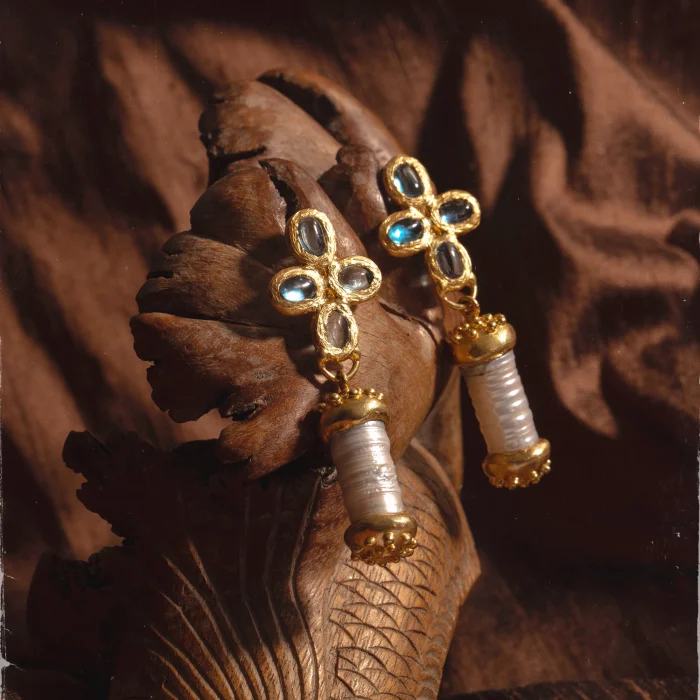 Asteria Küpeleri, geri dönüştürülmüş 925 ayar gümüşten üretilmiş, 24 ayar altın kaplamalı bir tasarımdır. Tamamen el yapımıdır ve Swiss Blue Topaz taşları ve İncilerle süslenmiştir.