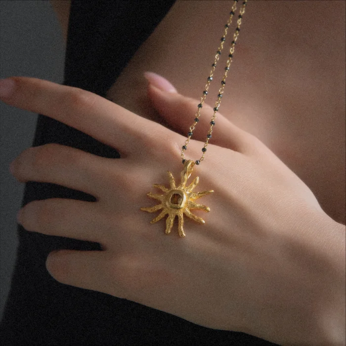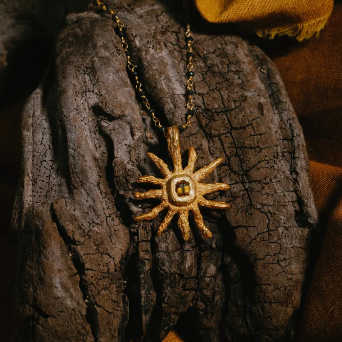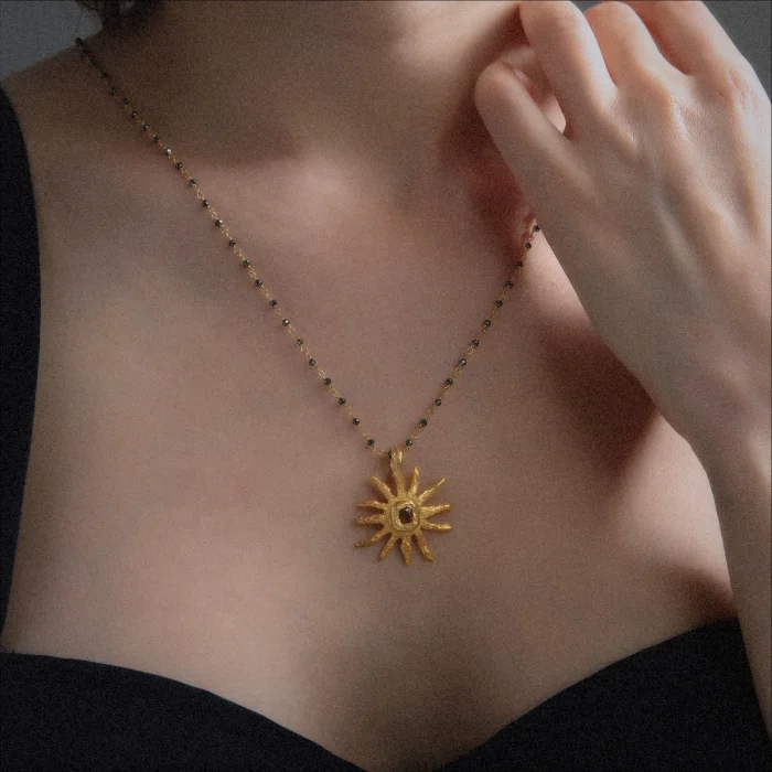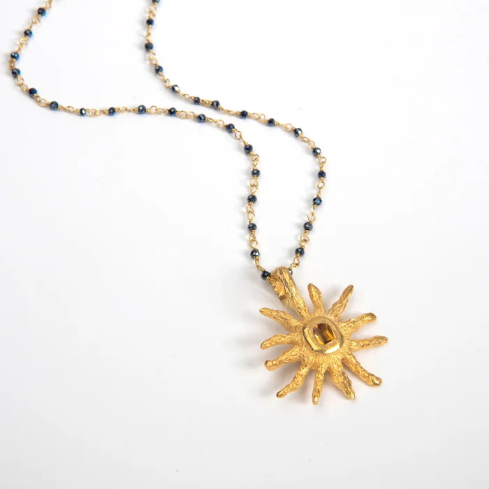 Eos Kolye, geri dönüştürülmüş 925 ayar gümüşten üretilmiş, 24 ayar altın kaplamalı bir tasarımdır. Tamamen el yapımıdır, Sarı Safir taşı süslenmiştir ve hematit zinciri ile tasarlanmıştır.
