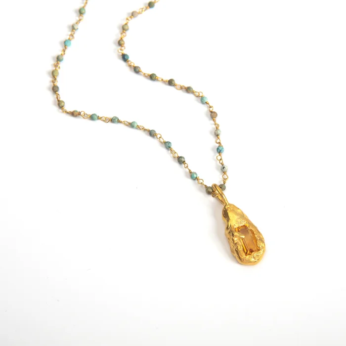 Maia Kolye, geri dönüştürülmüş 925 ayar gümüşten üretilmiş, 24 ayar altın kaplamalı bir tasarımdır. Tamamen el yapımıdır ve üzerinde sitrin taşı bulunurken, zinciri turkuaz ile süslenmiştir.