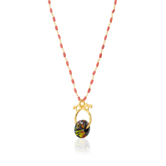 Tillu kolye, 925 ayar gümüş üzerine 24 ayar altın kaplama ile tamamen elde üretilmiştir. Antik murano camı ve kırmızı mercan zincirle tamamlanmıştır.