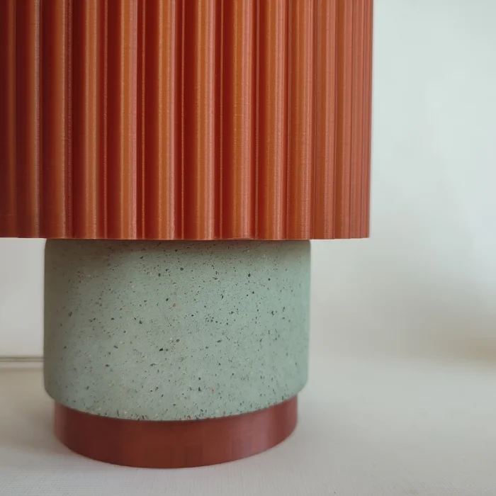 Abajurun destek parçalarının ve abajur başlığının tasarımı, tarafımdan yapılmış olup 3D yazıcı ile yenilenebilir, ahşap katkılı doğal biopolimer (PLA) malzemelerden üretilir. Çevre dostudur.