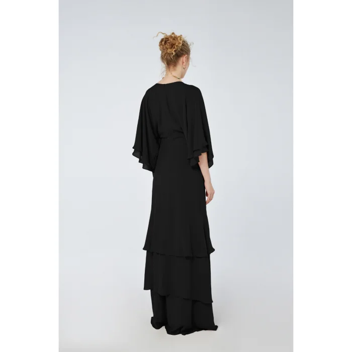Akıcı katmanlı etek, ince volan detaylarıyla tamamlanır.
