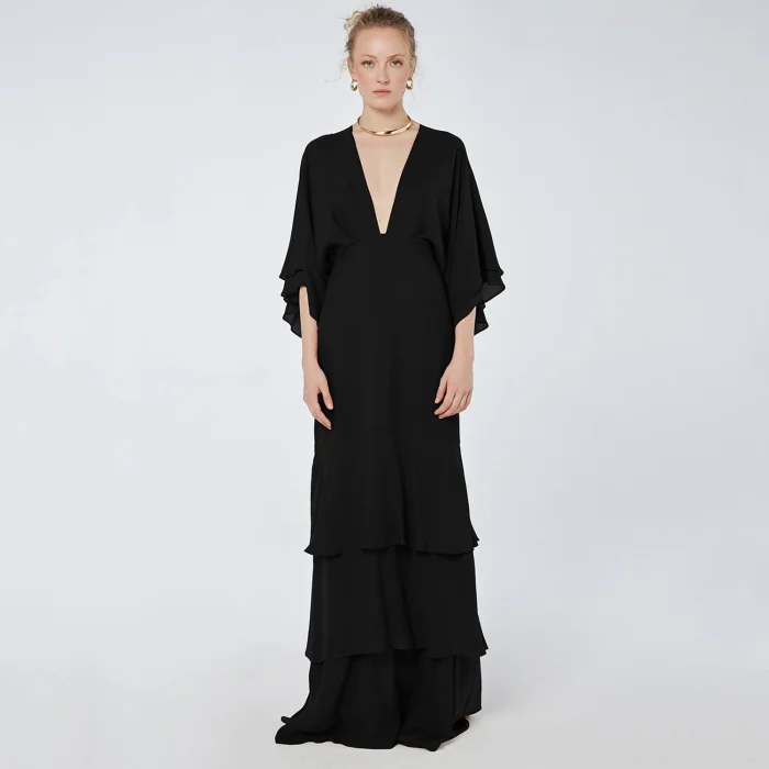 Yapılandırılmış feminen formları yumuşak ve akıcı katmanlarla buluşturan bu zarif maxi elbise, zahmetsiz ama çarpıcı bir görünüm sunar.