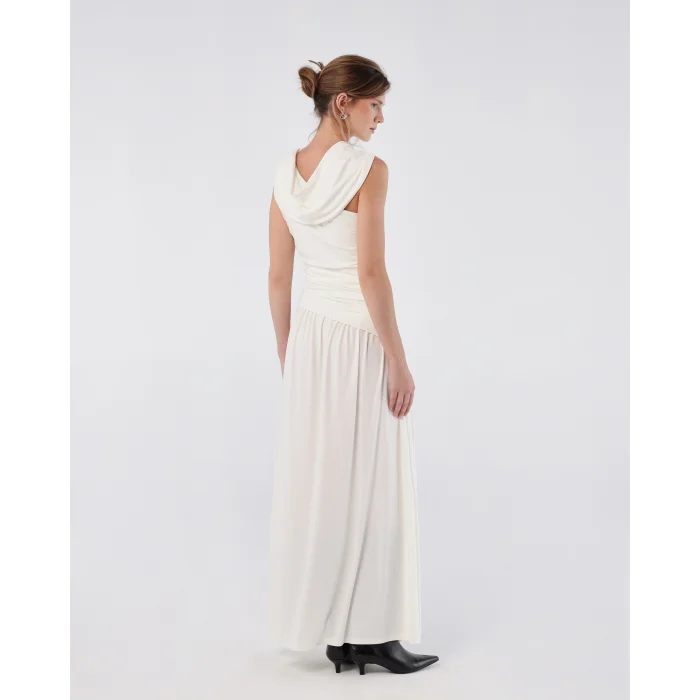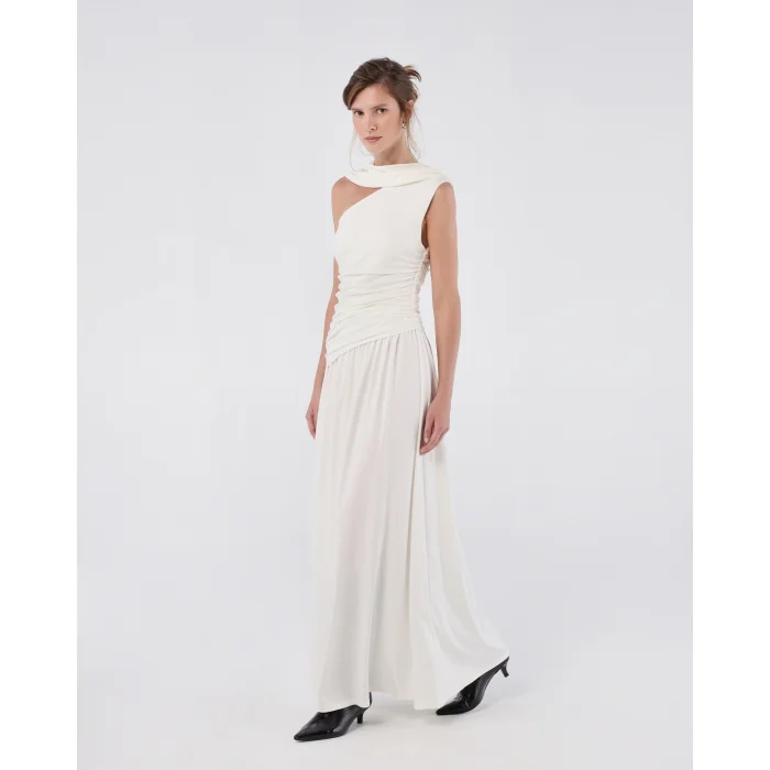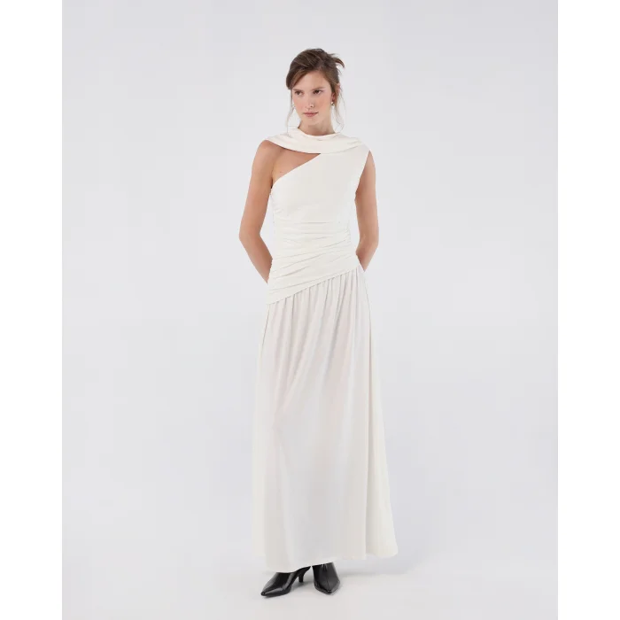 Asimetrik tek omuz tasarımı, sofistike bir dokunuş sağlar. Bedenin üzerinde zarif drape detayları, vücuda oturan şık bir görünüm sunar. Akıcı, tam boy etek zarif bir siluet oluşturur. Yumuşak ve esnek kumaş, maksimum konfor sağlar. Dökümlü sırt detayı, bu zamansız parçaya modern bir hava katar. Model 174 cm boyunda ve Small beden giymektedir.
