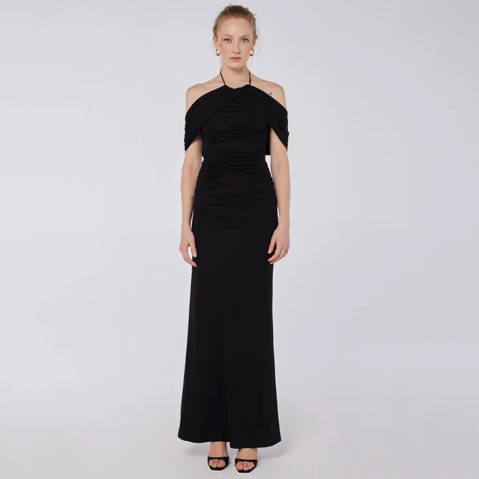 Bükümlü halter yaka ve omuzdan düşen drape detayı, zarif bir görünüm kazandırır.
