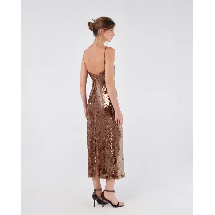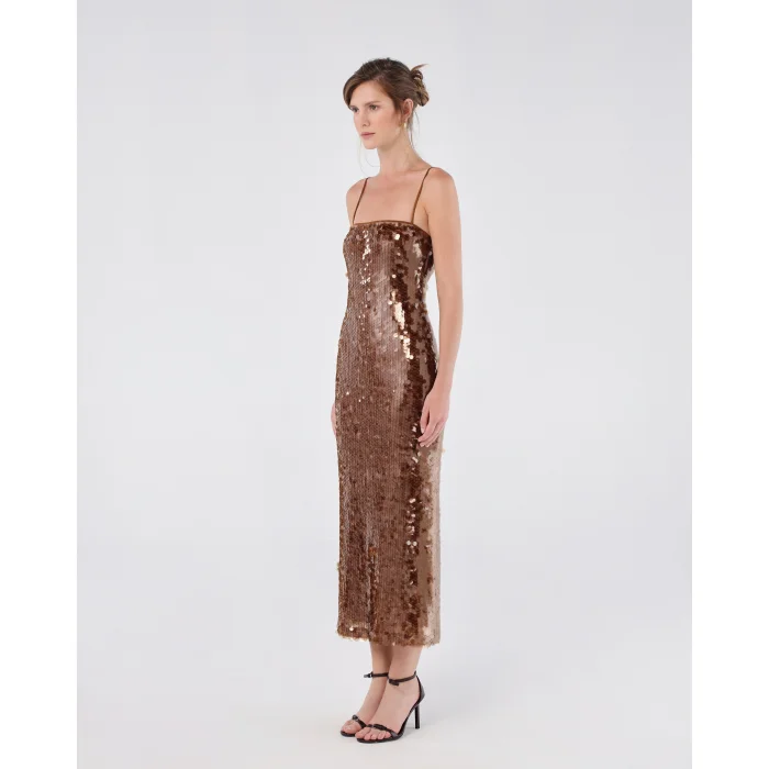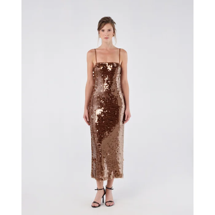 Işıltılı kahverengi payetler, göz alıcı ve dikkat çekici bir görünüm yaratır. İnce askılar ve vücuda oturan midi boy siluet, zarafeti artırır. Gizli arka fermuar, kusursuz bir uyum sağlar. Her akşam etkinliğinde fark yaratmak için mükemmel bir seçim. Model 174 cm boyunda ve Small beden giymektedir. Bu elbise, her özel günde kendinizi özgüvenli hissetmeniz ve gözleri üzerinize çekmeniz için tasarlanmıştır.
