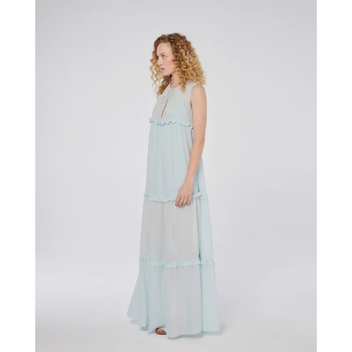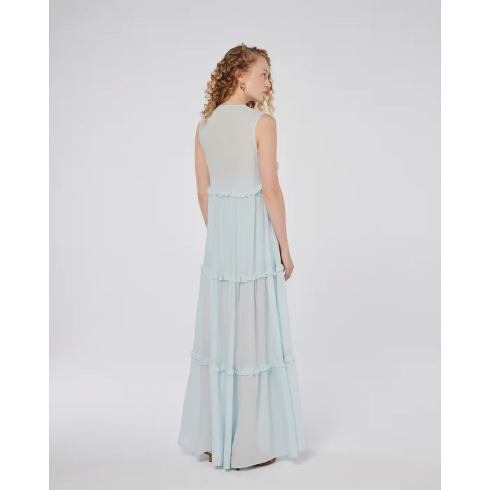 Akıcı katmanları ve zarif detaylarıyla zamansız bir tasarıma sahip bu maxi elbise, sade ama etkileyici bir şıklık sunarak çok yönlü ve sofistike bir görünüm yaratır.