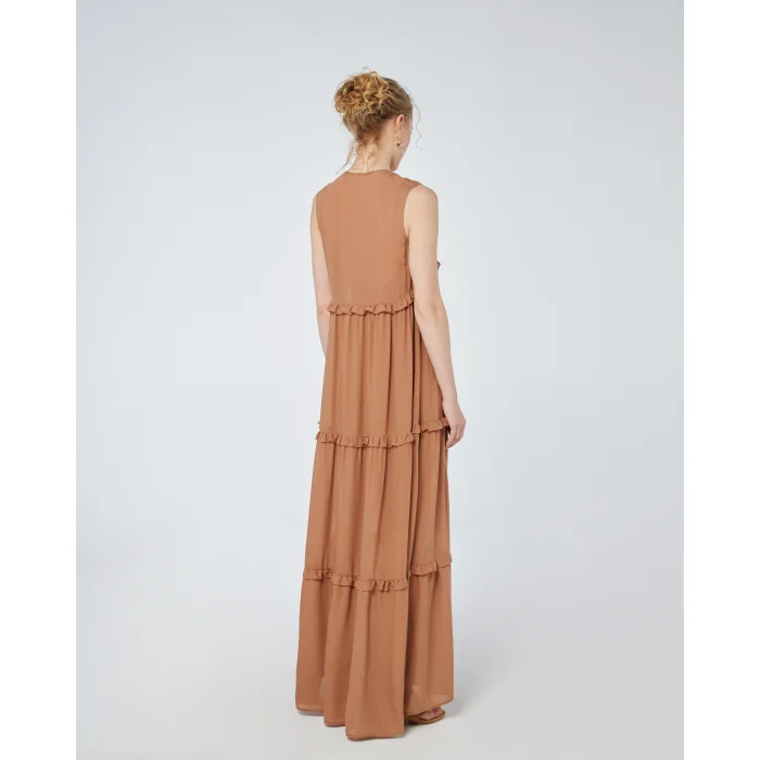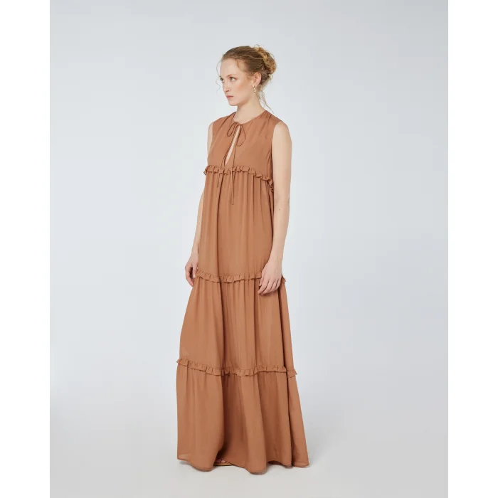 Akıcı katmanları ve zarif detaylarıyla zamansız bir tasarıma sahip bu maxi elbise, sade ama etkileyici bir şıklık sunarak çok yönlü ve sofistike bir görünüm yaratır.