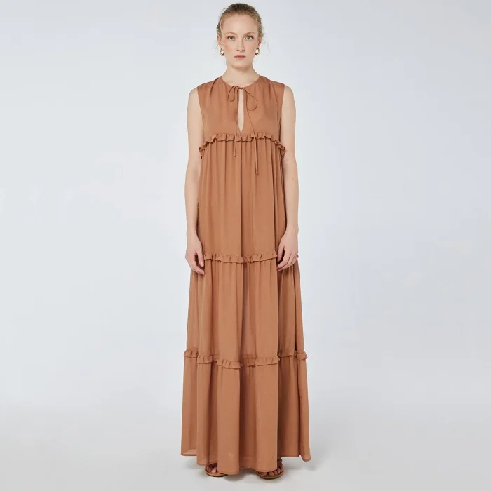 Akıcı katmanları ve zarif detaylarıyla zamansız bir tasarıma sahip bu maxi elbise, sade ama etkileyici bir şıklık sunarak çok yönlü ve sofistike bir görünüm yaratır.