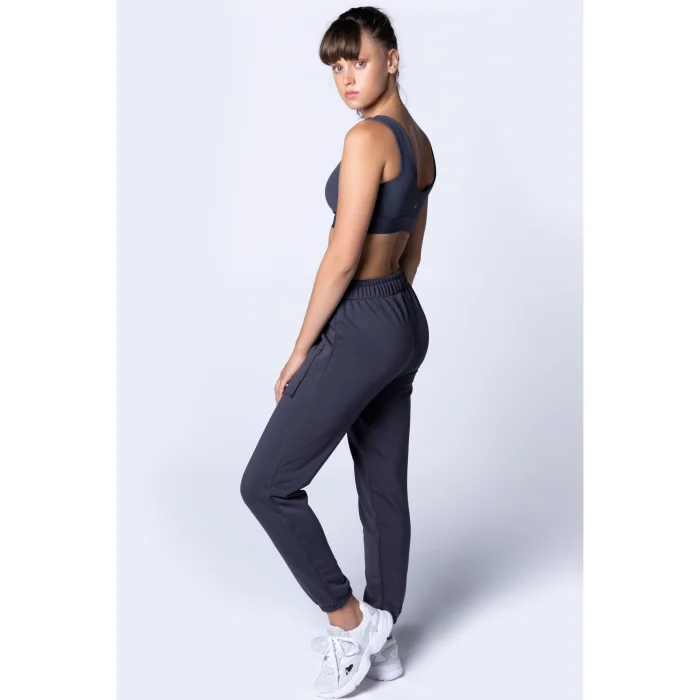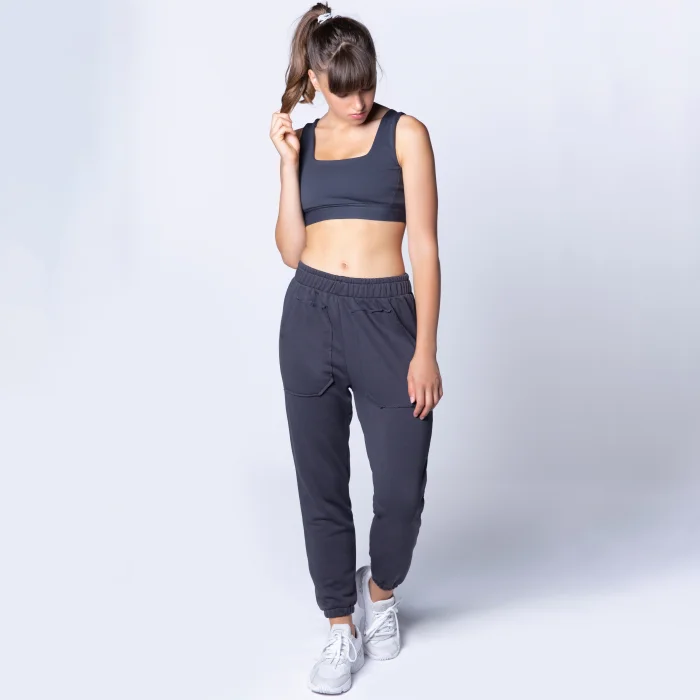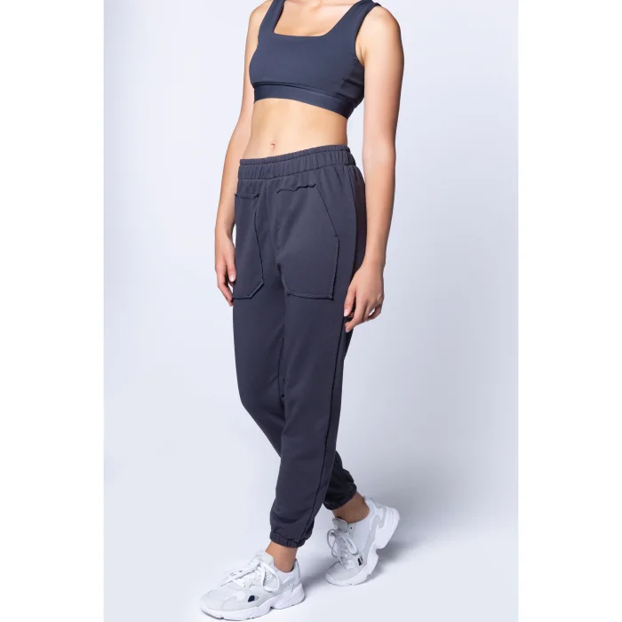 Yüksek belli, kanguru cepli ve bileği lastikli ağı düşük eşofman altı.