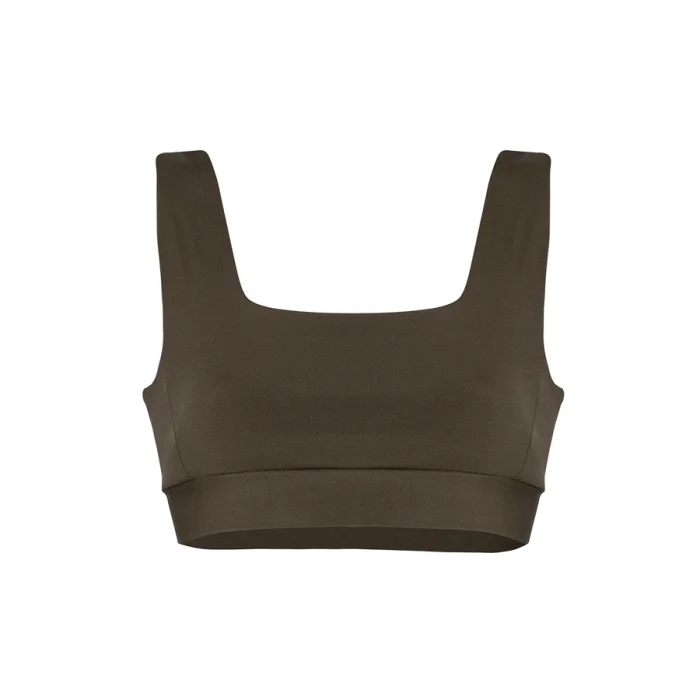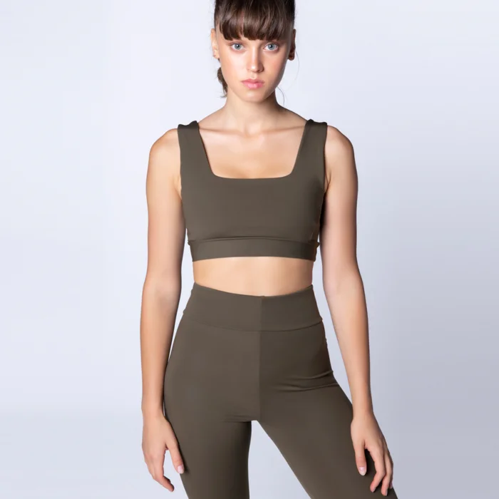Göğüs ve sırt dekolteli kare yaka haki bra. Çıkarılabilir göğüs kapları. Elastikiyeti sayesinde üst düzey rahatlık ve hareket kolaylığı, şekillendirici kumaşı sayesinde müthiş bir form sağlar.