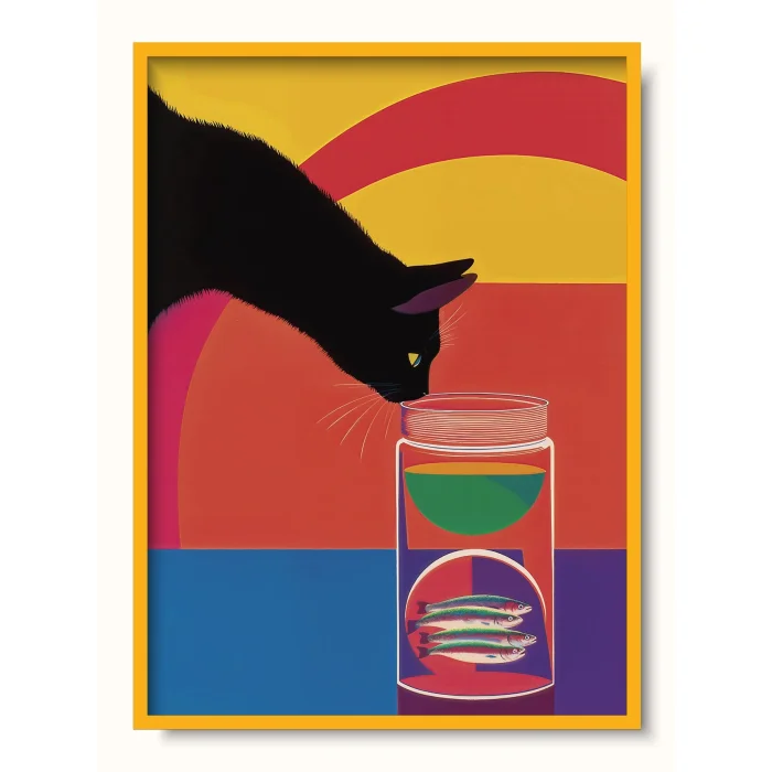 Dört küçük balığın bulunduğu cam kavanoza yakından bakan siyah bir kedi.