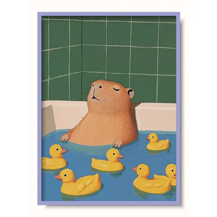 Küvette sarı ördeklerle huzur içinde keyif yapan bir kapibara.