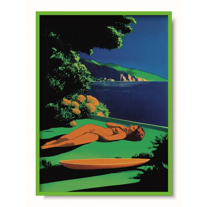 Arka planda sakin mavi okyanus suları uzak tepelere uzanırken, bir kano yanında uzanmış huzurlu bir figür.