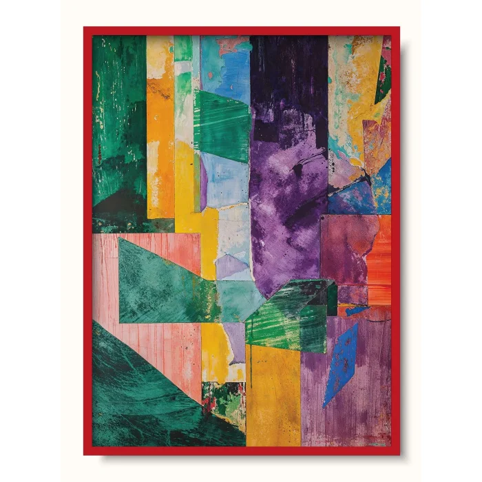 Keskin geometrilerin ve zengin, yıpranmış dokuların soyut bir birleşimi.