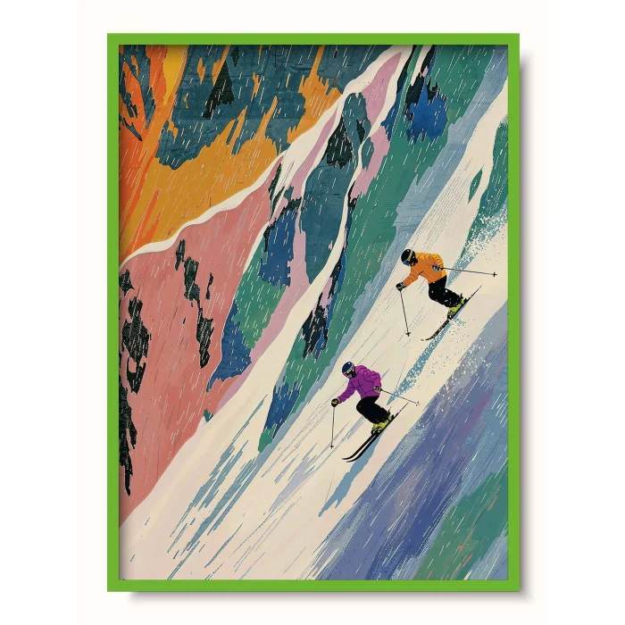 Dik yamaçtan aşağı inen iki kayakçı. Arka planda, turuncu, yeşil ve mavi tonlarında soyut ve canlı dağ etekleri.