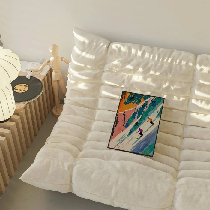 - Tasarım: Soyut dağ manzaralı kayakçı figürleri