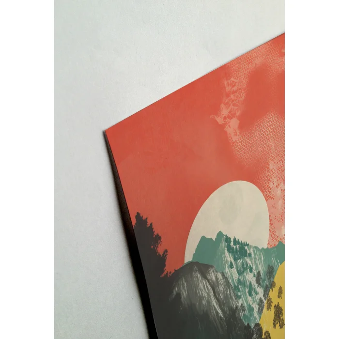 Ateş kırmızısı bir gökyüzü ile dağlık arazinin soğuk tonları arasındaki kontrastın bir yorumu.