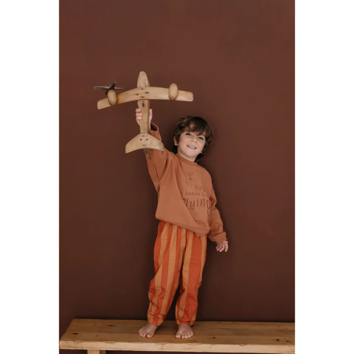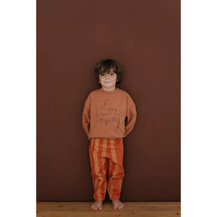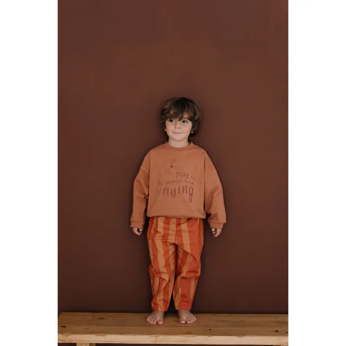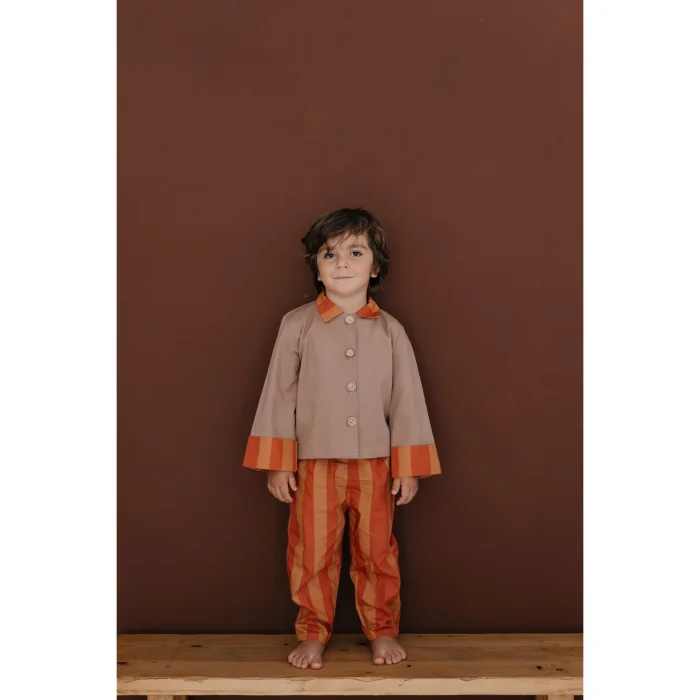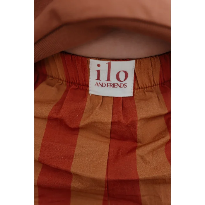 ilo+friends’in sevgi ve özenle elde hazırladığı, kendi çizgileriyle üretilmiş kırmızı ve turuncu tonlarda çizgili desenden oluşan %100 pamuk kumaşla tasarlanmış kız ve erkek / unisex bebek ve çocuk pantolonu. 1-8 yaş arası için opsiyonları bulunmaktadır. Miniklerin hem günlük kullanımda hem de özel günlerde rahatlıkla tercih edebileceği şık ve konforlu bir parçadır. Krem rengi, elde üretilmiş kendi özel torba/paketinde gönderilmektedir. Paketi dahi yalın ve özenli tasarımı ve sonrasında da kullanım opsiyonlarıyla çocukların ve ebeveynlerin konforu düşünülerek tasarlanmıştır. Kırmızı/bordo ve turuncu kalın çizgilerden oluşan kumaşıyla ferah, rahat ve orta kalınlıkta, sonbahar ve kış mevsimleri için oldukça kullanışlıdır. Doğal kumaşlarla tasarlanan baharlık pantolon, tek başına oldukça şık ve rahat, kolayca kombinlenebilir bir modeldir. Pantolunun eğlenceli ve zarif, doğadan ilham alan modern ve zamansız ilo and friends tasarımı çocukların enerjik ruhunu yansıtırken renkleriyle de yalınlığı ve neşeyi yansıtır. Lastikli beliyle kolay giyim sağlarken konforu ön planda tutar, paçalarındaki fırfır detayıyla da şıklık katar. Okulda giymek için de çokça tercih edilir.