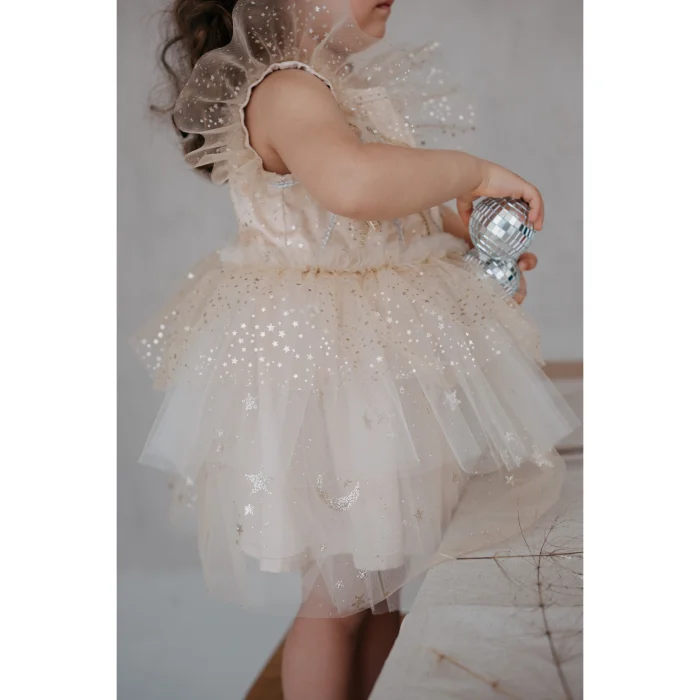 Yıldız figürlü, saten astarlı, krem rengi tül parti elbisesi.