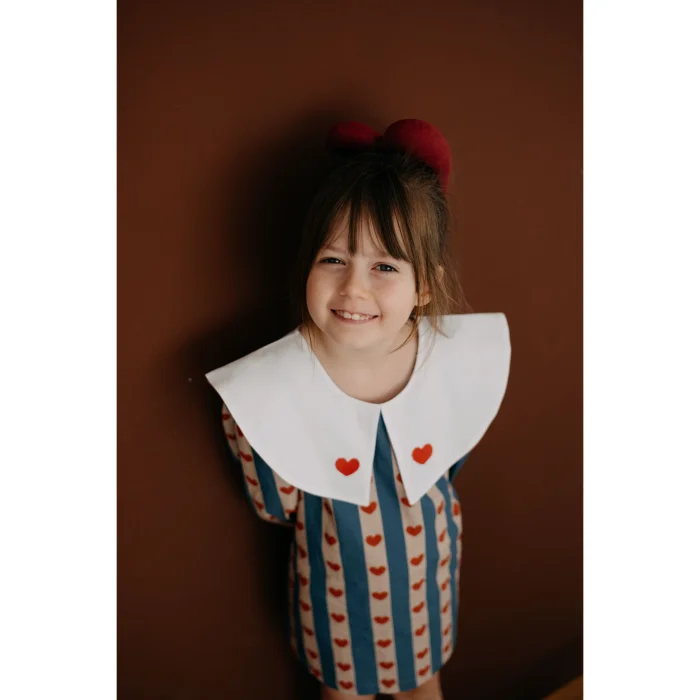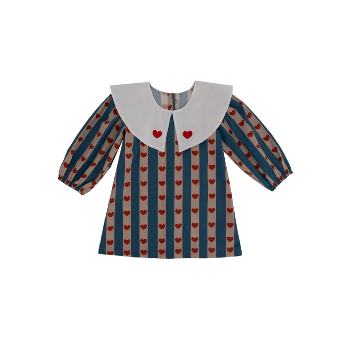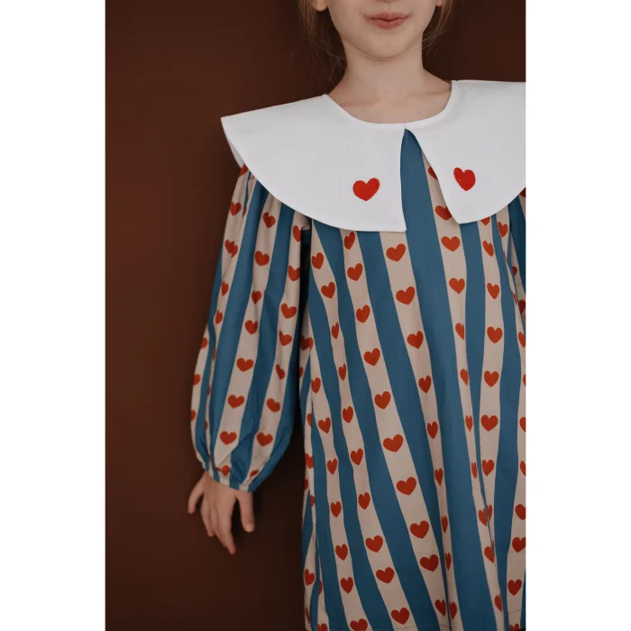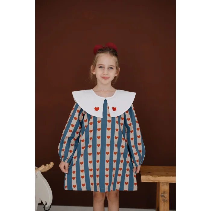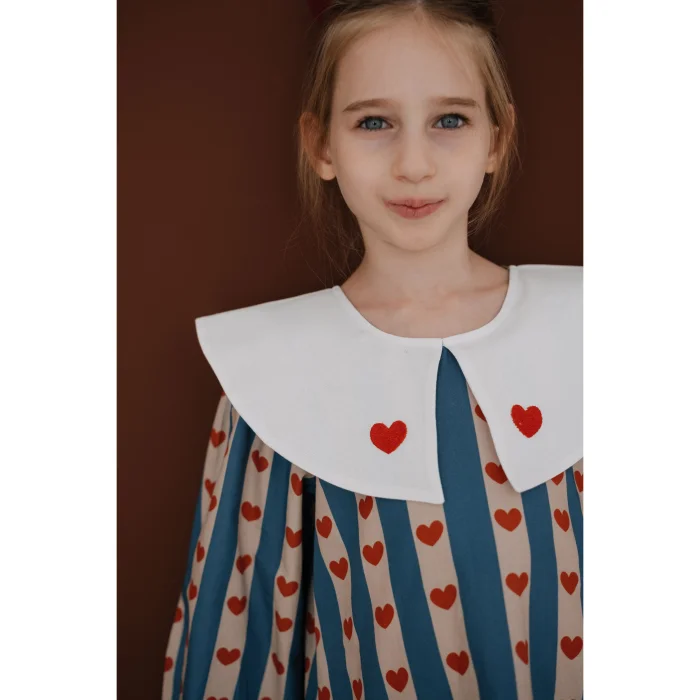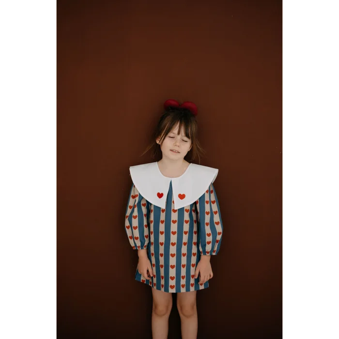 ilo+friends’in sevgi ve özenle elde hazırladığı çizgili, renkli ve kalp detaylı kız bebek ve çocuk elbisesi. 1-8 yaş arası için opsiyonları bulunmaktadır. Miniklerin hem günlük kullanımda hem de özel günlerde rahatlıkla tercih edebileceği şık ve konforlu bir parçadır. Krem rengi, elde üretilmiş kendi özel torba/paketinde gönderilmektedir. Paketi dahi yalın ve özenli tasarımı ve sonrasında da kullanım opsiyonlarıyla çocukların ve ebeveynlerin konforu düşünülerek tasarlanmıştır. Koyu mavi ve açık pembe tonlarında çizgileriyle üretilmiş, üzerinde kırmızı kalpler olan %100 pamuk kumaşıyla ferah, rahat ve orta kalınlıkta, sonbahar ve kış mevsimleri için oldukça kullanışlıdır. Doğal kumaşlarla ve ilo and friends çizimlerinden oluşan nakışıyla tasarlanan baharlık elbise, tek başına oldukça şık ve rahat, kolayca kombinlenebilir bir modeldir. Elbisenin eğlenceli mavi/lacivert, pembe ve kırmızı tonlarındaki renkleri ilo and friends'in modern ve zamansız tasarımıyla bir araya gelerek çocukların enerjik ruhunu yansıtırken renkleriyle de yalınlığı ve neşeyi yansıtır. Beyaz bebe yakasındaki koyu kırmızı minik kalplerle sevgi dolu çocuk ruhunu yansıtır. Arkasından düğmeli, giyimi kolay ve konforludur, ayrıca kırmızı düğmeleri ayrı bir şıklık katar. Bebek ve çocukların kafasından kolaylıkla geçer. Yaka ve kumaştaki kalp detaylarıyla neşe, eğlence ve şıklık; arkasında elbise boyunca olan kırmızı düğmeleri de elbiseyle müthiş bir uyum sağlarken kolay kullanım ve giyim sağlar.